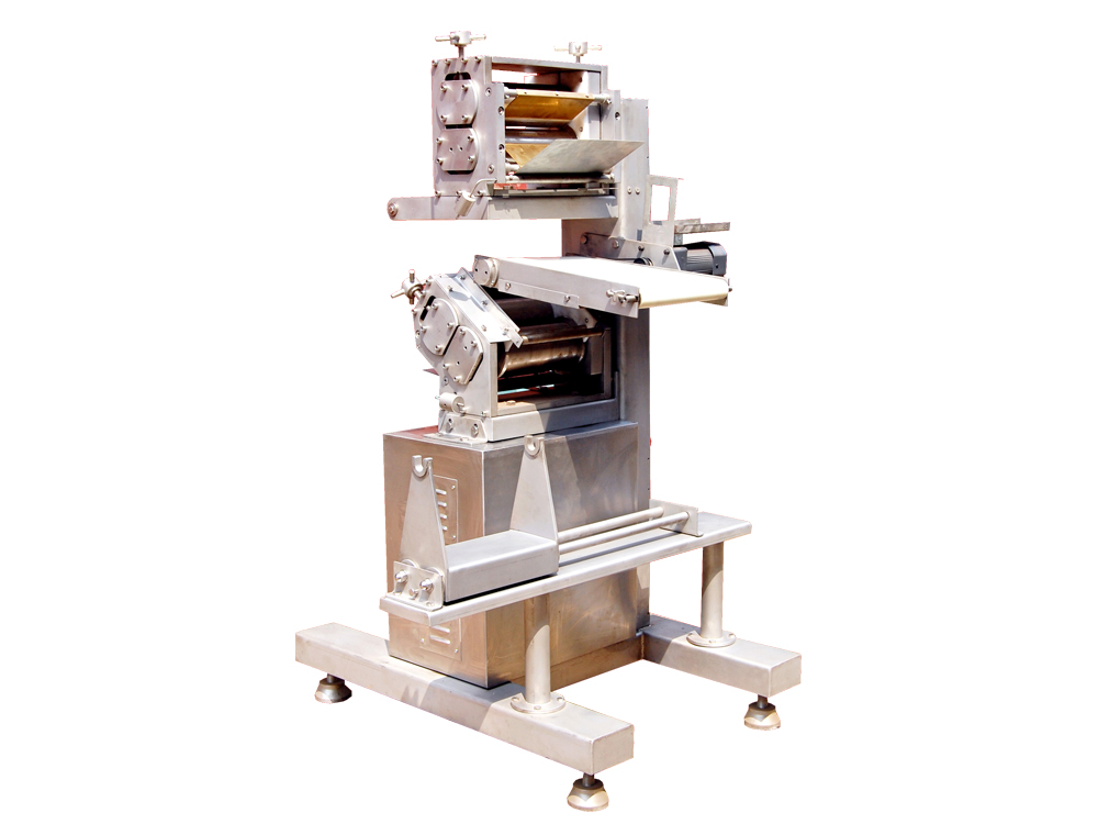 →復合、壓延、疊層、分切卷皮機系列  →型號215/230/280/330/360/540/560型。225型殘皮還原機  →功能  該系列為配套國內外品牌的餃子機、餛飩機使用的面帶軋制設備。  →特色  1、復合機搭配搗面裝置,可使真空和面機和制出的團狀、絮狀面團,自動連續的進入軋制過程。  2、疊層機使面帶Z字型折疊,進一步豐富面帶網狀結構,提高面筋度,設備可根據客戶場地需求選擇不同的擺放形式。  3、多組壓延機為變頻控制,每一道壓輥都采用單機驅動,通過測距傳感器,實現自動面帶張緊控制,多輥聯動。進一步簡化操作,保證壓延比,滿足多種工藝要求,加工出質量穩定的面帶。  4、可根據不同餃子機要求軋制不同 規格厚度及寬度的面帶,面帶經過分切后自動打卷,操作簡單,安全可靠。  5、以上設備均采用不銹鋼軋輥,及符合國家衛生標準材料。  6、具體壓輥對數可根據客戶實際需求定制。  →主要技術參數產品型號總功率(kW)高線速度(m/min)壓面厚度(mm)電壓(V)外形尺寸長×寬×高(mm)215型8.1515457263807104*764*1356230型8.1515457263807104*764*1356280型8.1515457263807104*764*1356330型8.9515457263807104* 884*1356360型8.9515457263807104* 884*1356400型8.9515457263807104* 884*1356540型13154572638010386*1400*1400560型13154572638010386*1400*1400225型殘皮還原機1.58.26380950*1130*1500